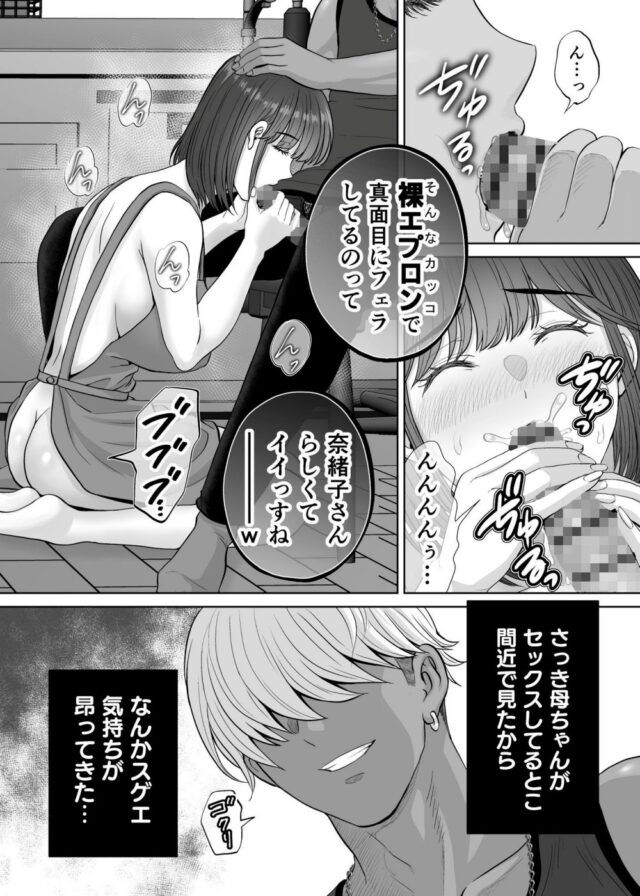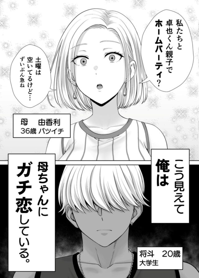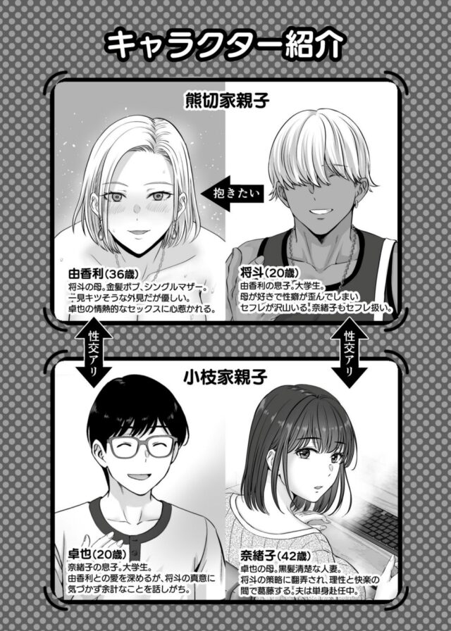 2組の親子が集うホームパーティ。由香利は結婚前の顔合わせのつもりで奈緒子の家へ挨拶にいくが、実はそれは将斗の計画による乱交パーティだった…!卓也を丸め込み、友だちの母親をそれぞれ抱きながらついに見せ合いセックスに発展!何度も抱かれてすっかり将斗にほだされてしまった奈緒子は息子の卓也に見られながら何度も絶頂してしまう。そして奈緒子へ結婚の報告をした由香利と卓也は奈緒子の目の前でラブラブのセックスを開始。ヤりたい放題のセックスを思う存分楽しむ息子たち。将斗は自分の母親のイク瞬間を間近で見ながら、奈緒子に激しくピストンする!そしてそんな将斗とのセックスのさなか、ついに奈緒子は将斗の様子に気が付いて…!?4人の愛と欲望が絡み合う!母スワッピング第三章!!!