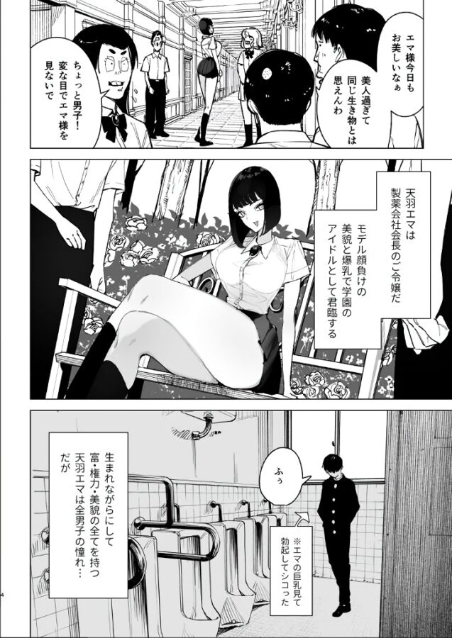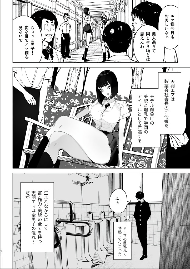 僕は高田(39歳)。お嬢様学校で用務員をしている…手取り11万、恋愛経験無し。そこの生徒、天羽エマ(あまはねエマ)は誰もが憧れる学園一の美人。そして製薬会社の会長を親にもつご令嬢だ。誰も彼女に逆らうことはできない…。俺の方が遥かに年上なのに嫌がらせを受け続けている始末。クズ令嬢が!しかし天羽エマは爆乳で、小顔で、背が高くて、脚が長くて、女優に引けを取らないほどの美人だ…。ちくしょうお前エロすぎんだよ!…いつかハメまくりてえよお!ちくしょおおおお!………そんな俺の夢が、ネットで覚えた催●術である日突然、叶った………!
